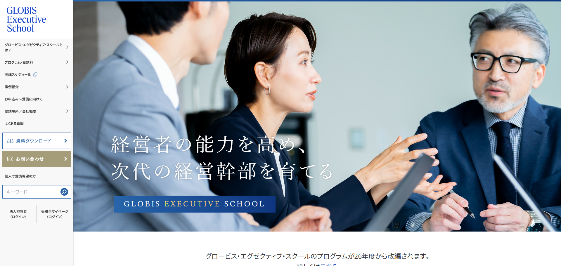 | グロービス | (株)グロービス | 上級向け|MBAの知見に基づく。経営視点・戦略的思考を強化。 | 集合/オンライン | 要見積もり(企業派遣型) |